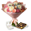 - Ein Strauß aus weißen, violetten oder rosa Chrysanthemen, Rosen und Eukalyptus;